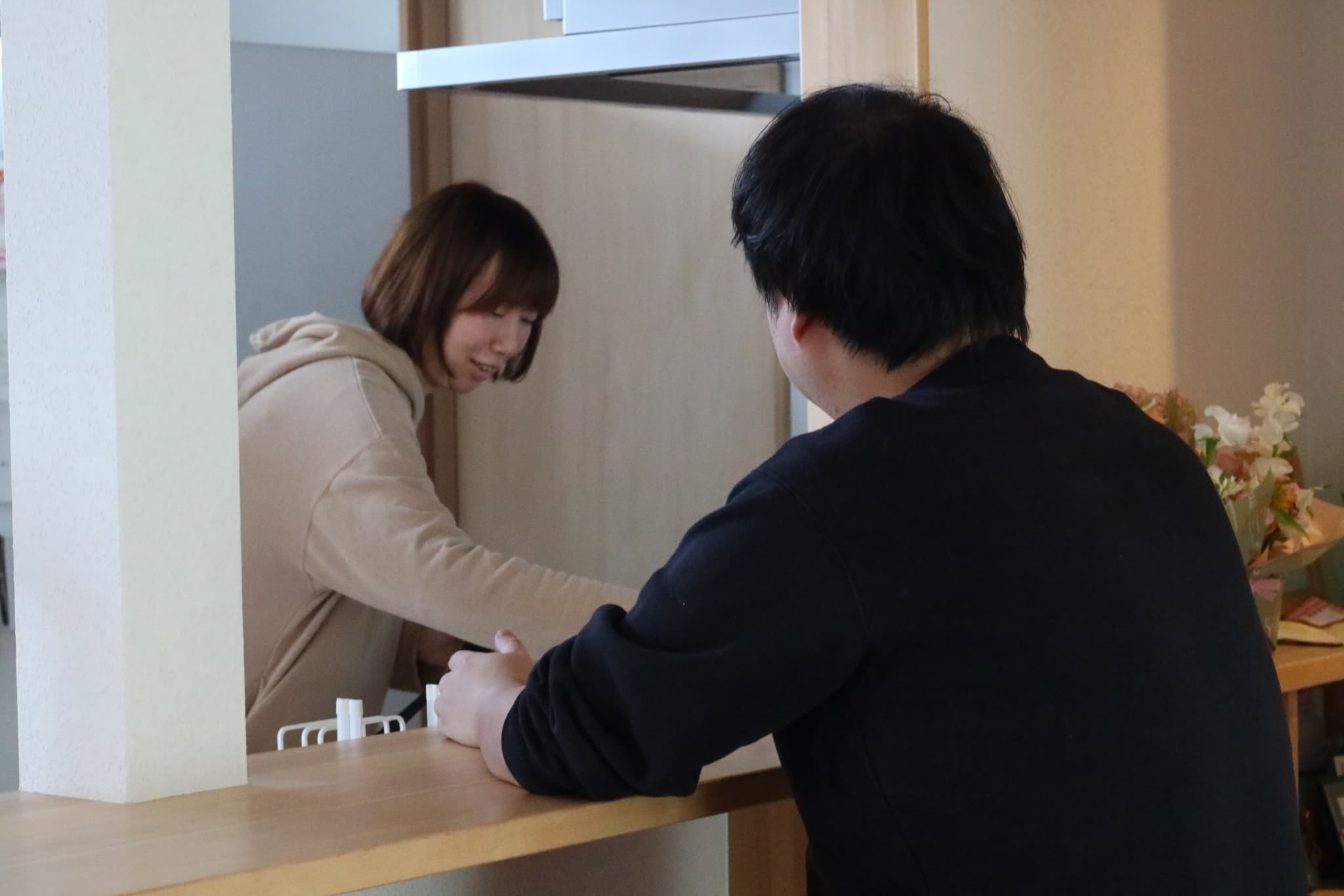 お料理が大好きな奥様が立たれるキッチンからは、開放感たっぷりの吹き抜けがあるリビング・ダイニングを見渡せます。